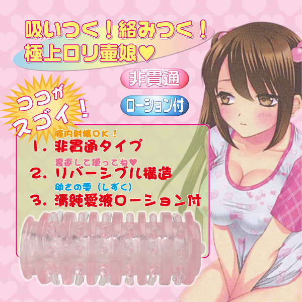 ロングセラーホール「まんぽこりんパート2」が進化し、「まんぽこりんスペシャル」としてリニューアル♪極上のロリ娘を表現したこのホールは非貫通タイプで、引き抜く時の吸い付き感と絡み付き感がたまらない逸品です!膣内射精も可能で、リバーシブルタイプで裏返せば異なる快感が楽しめます。付属の清純愛液ローションを使ってねっとりとしたプレイをお楽しみください♪まんぽこりんスペシャルで新たな快感を体感しましょう!