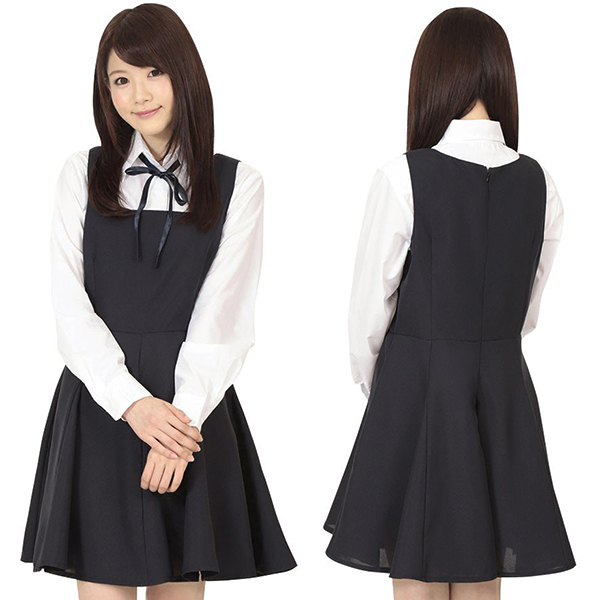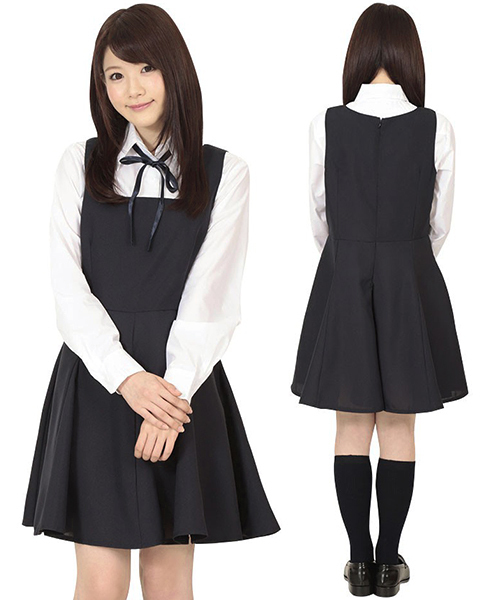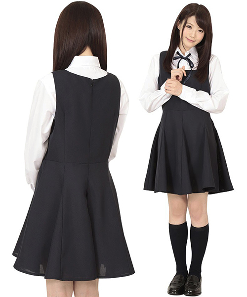 長めのスカートがポイント!清楚な印象を与える、お嬢様系制服コスチューム。●ネイビー×ホワイト●清楚な印象のロングジャンパースカート(背面ファスナー)●長袖ブラウス(ボタン)●女の子らしくキュートに決まるリボン紐。可憐なお嬢様に変身できちゃうコスプレセットです。※靴下は付属しません。