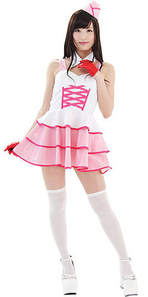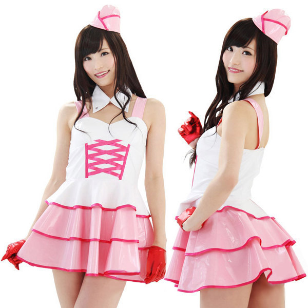 どんな振り付けで歌おうかな?テカテカ素材が近未来っぽいアイドル風コスチューム。●白&ピンクのビスチェ風ワンピース●みんなの注目が集まっちゃう・キュートな3段ティアード●アーミーテイストのミニキャップ(ピン2本つき)●とんがり襟がCOOLな白い付け襟。編上げやパイピングに濃い色を使ってメリハリを効かせた、エナメル調のセクシーコスチュームです。※手袋、ストッキングは付属しません。