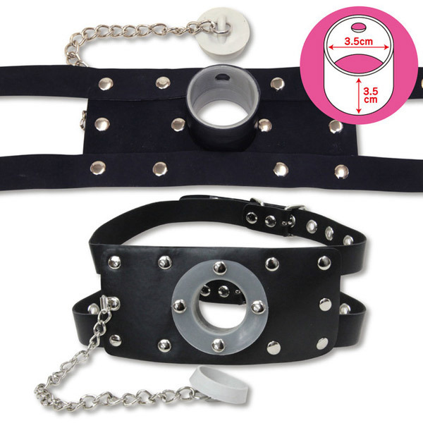 排水栓付きで羞恥心も倍増!拘束プレイ用の開口式マウスギャグ。●シックなブラックフェイクレザー●スタッズ使いがハードな本格派●筒型の口枷内径は3.5φcm●チェーン付きの栓で開閉可能●上下2本のベルトで調節&固定可。筒状のマウスオープナー+栓で口をガッツリ拘束できるプラグ付き口枷。栓を外せば丸見えの口腔内から涎がダラダラと溢れ出る凌辱仕様のSMグッズ!閉じることの許されない開口式なので強制挿入も可能です。