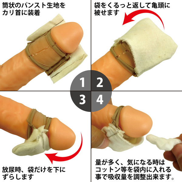 思いがけないチョイ漏れに!意図せず出てしまう残尿をケアしてくれる男性用サポートグッズ。●ネル生地×ストッキング生地製●亀頭にかぶせるようにして装着●生地をズラすだけでトイレもOK●柔らか生地で締付けの痛みナシ●洗浄することで繰り返し使用可●通気性があるのでムレずに安心●袋部分にコットン等を入れれば吸水量の調節も可能。自分の意志だけではどうにもならない残尿に物申す!シミという悲劇を未然に防いでくれる頼もしいペニス用サポートアイテム。筒状のストッキング部分を通して装着、ポケット状の袋カバーを亀頭にかぶせるだけの手軽さもポイントです。