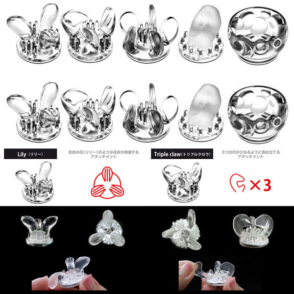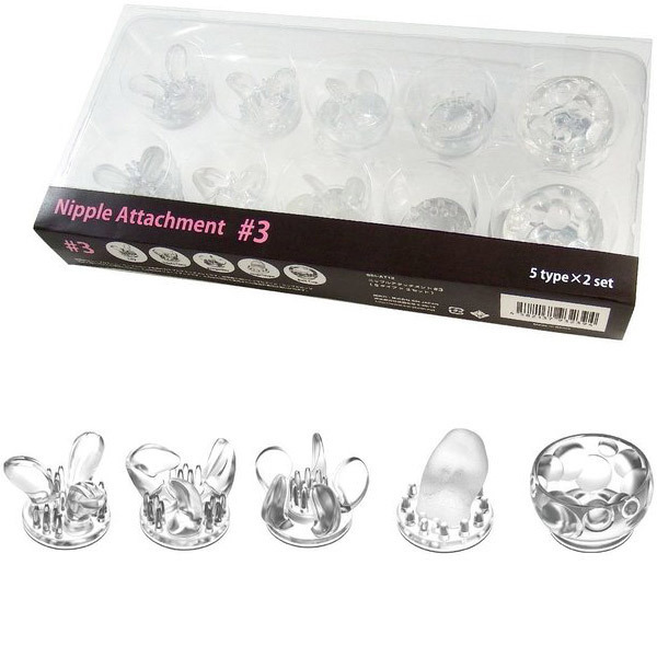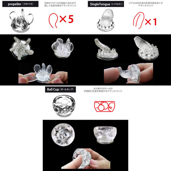 吸引&振動で責めるチクニーマシーン「ニップルドーム」専用の付け替え用アタッチメント。●お肌に優しいソフト弾力素材●本体付属と同形状の5種×各2個●リリー:百合の花びら風●トリプルクロー:3つのツメ型●プロペラ:中央ブラシ+5枚ヒダ●シングルタン:リアルなザラザラ舌●ボールカップ:大小ボール●簡単着脱のマグネット式。ニップルドーム付属のアタッチメントが破損や劣化、紛失で使えなくなってしまった…そんな方に朗報!計5種の多彩な刺激を楽しめるスペア用アタッチメントが登場しました。左右で別々のアタッチメントを装着して異なる刺激を楽しんだりと遊び方も多種多様です。こちらの「#3」セットは、ニップルドーム本体のブラック(b23838)、ホワイト(b23826)に付属しているアタッチメントと同形状です。