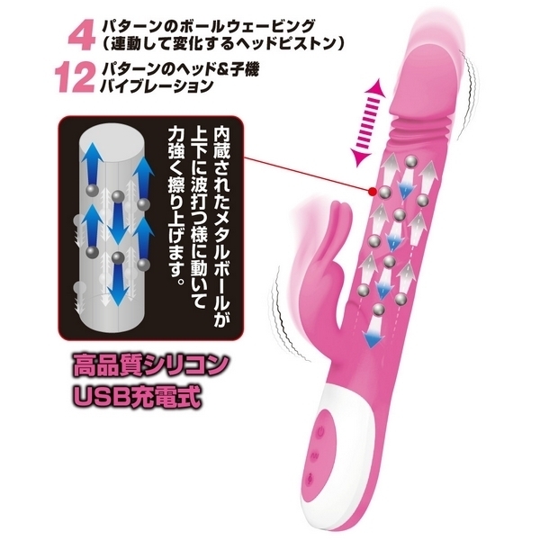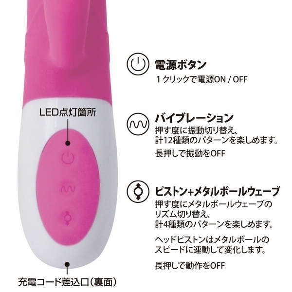 力強く擦り上げる激しい快感!内蔵ボールが波打つピストンバイブ「プリティラブ ピストンストローカー」。●先端が上下に動くピストンモデル●内蔵ボールが波打つウェーブ機能●ピストン&ボールのパターンは4種類●ボールはピストンアクションと連動●ヘッド&クリバイブに12種振動搭載●手触りの良い高品質シリコンボディ●丸洗い可能な生活防水仕様で衛生的●タフなUSB充電式(専用コード付属)。ボールと連動するピストンヘッドでポルチオ開発!異なる3つの快感が同時に楽しめる「プリティラブ」シリーズのピストンバイブ。ズンズン突き上げるピストンとズリズリ擦り上げるメタルボールの刺激に加え、先端ヘッド&クリバイブのダブル振動というバリエーション豊かなアクションで飽きのこない快感を楽しめます。