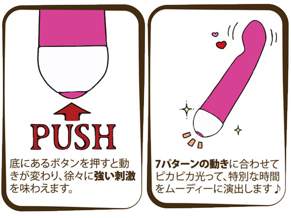 可愛いフォルムでしっかり刺激♪充実機能を搭載したスティックローター。●マットな質感で心地よい肌触り●丸い先端はプニっと柔らか●扱いやすく手にフィット●リズミカルな7パターン振動搭載●底部ボタンを押す度に振動が変化●振動と連動して持ち手が点灯●お手入れ簡単な生活防水仕様。コンパクトフォルムでも高性能!指先のようにクイッと曲がった先端フォルムと多彩なバイブレーションで、快感ポイントを狙い撃ちできるハンディローターです。