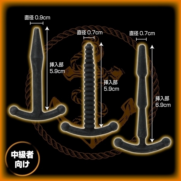 CBT中級者さんの尿道責めプレイに♪錨デザインの尿道プラグ3個セット「メイルデバイスアンカー インターメディエイト」。●マニア向けの尿道プラグ×3個セット●柔軟性のある高品質シリコンを採用●長さのある中級者向けのミドルサイズ●タイプ1:挿入部長5.9cm×直径0.9cm●挿入しやすい矢尻型のヘッド形状●タイプ2:挿入部長5.9cm×直径0.7cm●最初から最後まで続く凸凹リブ形状●タイプ3:挿入部長6.9cm×直径0.7cm●引き抜き時が刺激的な3連の円錐形状。究極の快感テクニック、尿道責めで新たな快楽を!フェティッシュなCBTプレイ用のSMグッズ。刺激の高さと負担の少なさを両立させた程良い長さの「インターメディエイト」タイプは、尿道責めプレイ中級者さんの拡張用にも最適です。