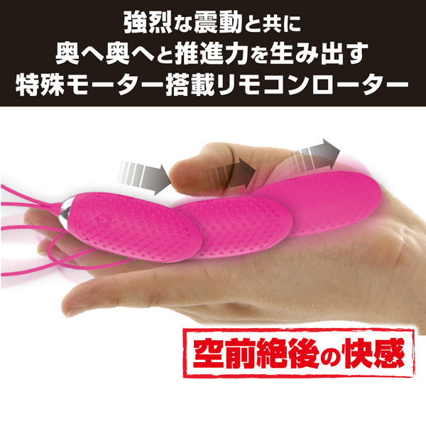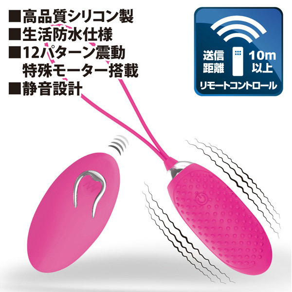 膣の奥へと突き進む強烈振動が特徴のリモコンローター「プリティラブ リモートエッグ2 ストロベリー」。イチゴのような凸凹フォルムのローターは心地良い挿入感の高品質シリコン製。スイッチオンで12種類の多彩な振動パターンと共に、膣の中を突き進む生き物のような動きでGスポやポルチオまで刺激します。最大10mの距離から遠隔操作できるワイヤレス仕様で屋外プレイも楽しめる生活防水&静音設計のストロベリー。本体はUSB充電式(専用コード付属)、フル充電約65分で約46分連続稼働!リモコンは単四電池×1本(別売り)を使用します。