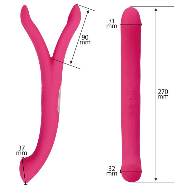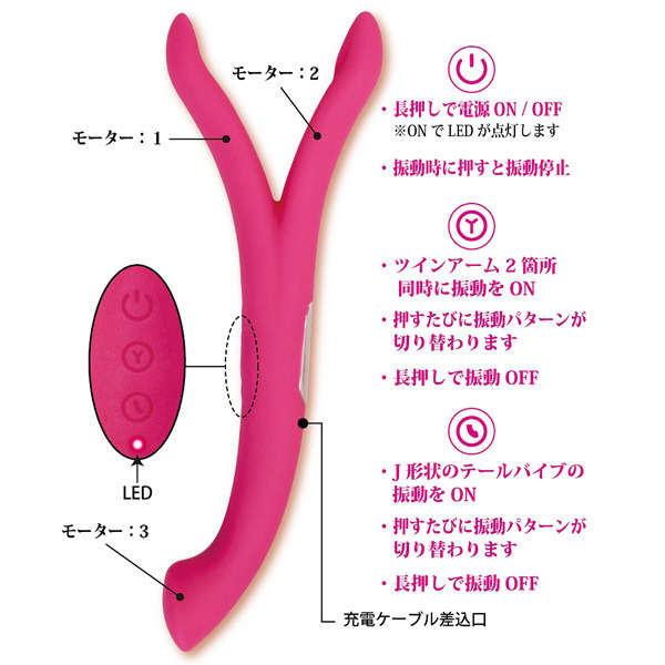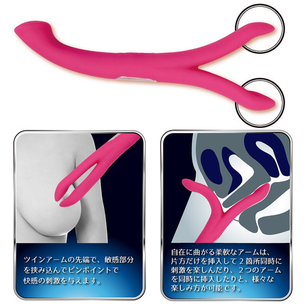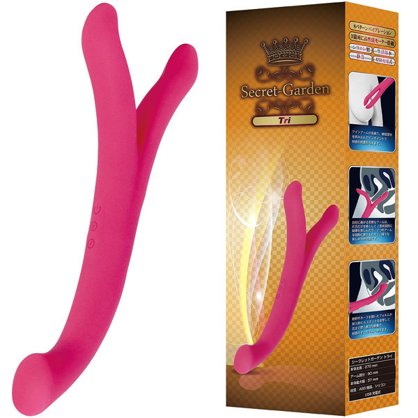 3分間以内のアクメ率なんと92%の瞬間絶頂!挟み込み&挿入どちらも楽しめるツインアームの双頭バイブ「シークレットガーデン トライ」。シリコン製のボディそれぞれの先端3ヶ所に、8パターン振動を備えた高性能モーターを搭載。二股のアームで乳首やクリをピンポイントで挟み込み!また、J型に絶妙なカーブを描く逆側のテールバイブはGスポットを確実に捉え、芯まで響くアクメ必至の強力刺激をもたらします。自在に曲がる柔軟なアームは片方だけを挿入して二ヶ所同時刺激や、二つのアームを同時に挿入したりとマルチに楽しめます。USB充電式(専用コード付属)。