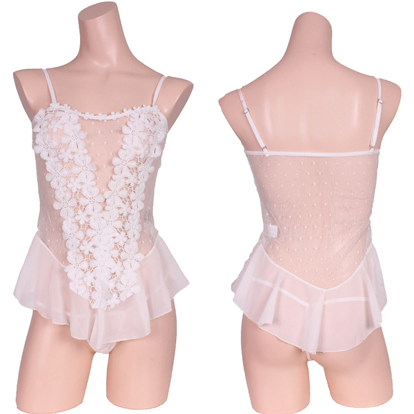 フロントに花柄モチーフをVラインにあしらい、裾のシフォンフリルでウエストのくびれを強調!ベースは模様入りストレッチネットだからフィット感抜群のベビードールとTバックの豪華セット。癒やしのホワイトカラー!※こちらの商品は受注発注商品の為、ご注文から発送までに3、4営業日掛かる場合が御座います。