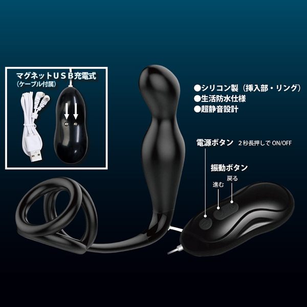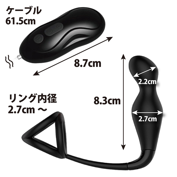前立腺からペニスまで、広範囲の刺激が味わえる!電動エネマグラの登場です♪先端部は最大2.2cm、胴体部分は最大2.7cmの幅で凹凸感を楽しめるデザインとなっています。本体の大きさは8.3cmと少し小ぶりですが、12パターンもの強力振動を搭載!アナル内部でエネマグラが振動することで前立腺を刺激し、そこからコードが回り込むようにして会陰やペニスへと振動を響かせつつ、トリプルリングの締め付けで強烈な相乗効果を生み出します♪絶頂時には全身を電気が走り抜けるような射精感が襲いかかり、アッという間に果てていることでしょう。本体の素材はお肌に優しい高品質医療用シリコンを採用!生活防水も搭載されているのでお手入れ楽々♪また、オンオフはボタンを2秒長押しするだけの簡単操作だから扱いやすいのもポイント。手軽な電動エネマグラで、貴方もかつてない射精感を体験してみませんか?