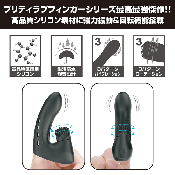 プリティラブのフィンガーシリーズに最高最強傑作登場!高品質シリコン素材に強力振動+回転機能を搭載!!だれでも超テクニシャンの指技で必ずイカせます!!!●3パターンバイブレーション●3パターンローテーション●高品質医療レベルシリコン●生活防水●静音設計充電時間:60分●連続稼働時間:40分