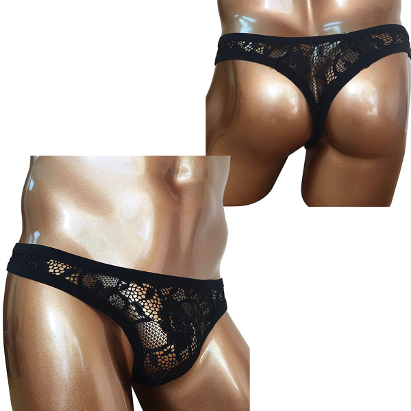 黒の花柄レースが男を華やかに魅せるメンズ用Tバック(ブラック)。網目から程よく透けて見える露出度高めのセクシーな男性用ビキニパンツ!エレガントなデザインは女装用下着に最適です♪生地には伸縮性高く涼しげな素材を使用!洗濯はネットに入れて行うか、手洗いで優しく洗って下さい。