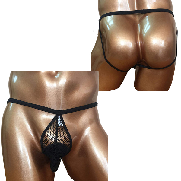 黒のメッシュ素材で男の象徴をワイルドかつセクシーに演出するメンズ用Oバック(黒)。網タイツのようなハンモック型のサオポケットが付いたフィット感抜群な男性用ショーツ!通気性が良いため暑く蒸れやすい日に最適です♪優しく手洗い、または網ネットに入れて洗濯してください。