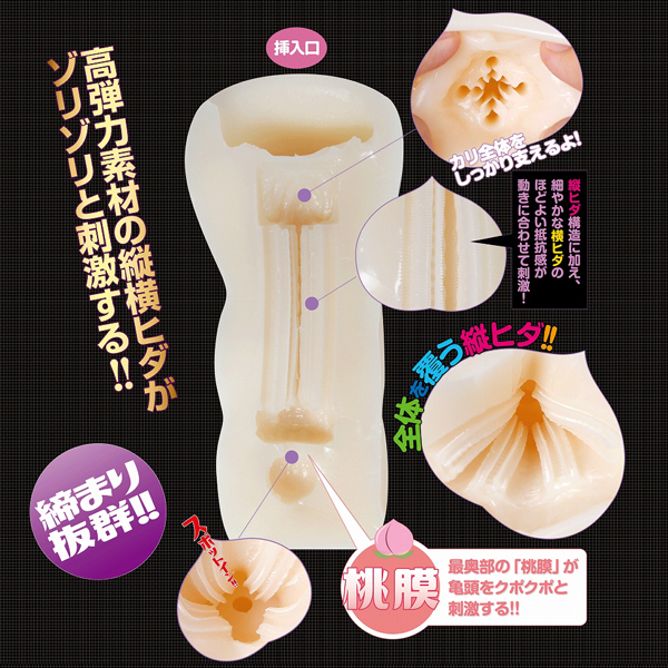 前作「桃ずきんちゃんdeもんもん!」にハリのある高弾力素材を使用した日本製の非貫通オナホが新登場。非貫通ならではのバキューム感と硬め素材の締め付けが、内壁に張り巡らされた縦横ヒダをしっかりアピール!最奥には亀頭をクポクポとはめ込むような「桃膜」が配置され、全方向から貴男のムスコを激しく責める!ローション付属