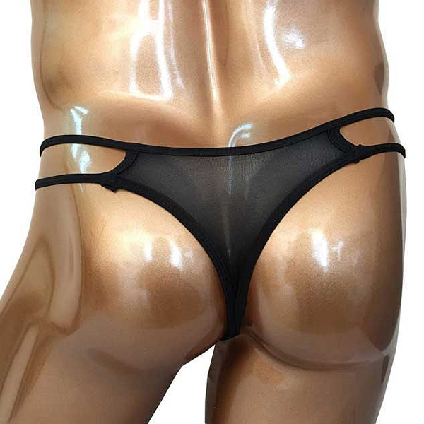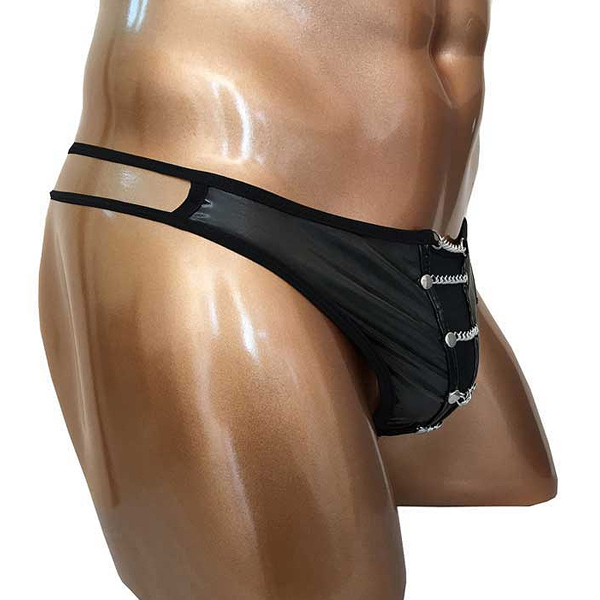 フロントにチェーンを装飾した格好いい男性用タンガ風Tバック。シンボル部分とバックはシアー素材になっており涼し気な印象です♪サイドはお洒落なダブルストリング仕様。ブラックカラー、フリーサイズ