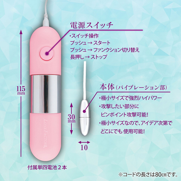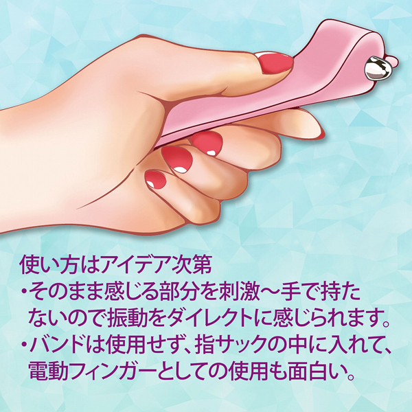 【単四電池×2本(付属)】長さ3cm、幅1cmの超ミニローター。しかしながら驚きのハイパワーを搭載!極小サイズなので、当てたい場所にダイレクトに攻撃が可能。付属の専用ベルトを使えば、手で持たないので、威力をなくすことなく、振動をダイレクトに感じられます。指サックの中に入れて、電動フィンガーとしての使用も可能です。
