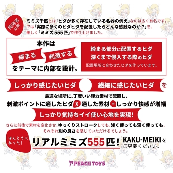 「締まる」「刺激する」をコンセプトに内部設計された、リアルに555本のヒダを配置した非貫通オナホ「KAKU−MEIKI MIMIZU555」です。ミミズ千匹とは「ヒダが多く存在している名器の例え」なのは広く有名ですが、では「実際に多くのヒダヒダを配置したらどんな感触なのか?」という疑問に答えるべく美しく「ミミズ555匹」で作り上げました!隆起するコブに突起もしっかりと配置し、どんな挿入角度でも、ゆっくりなストロークでも速いストロークでも楽しめる極上ヒダ仕様のオナホとなっています♪内部は挿入直後に配置された大玉4つがゴリっとした圧迫感を与え、ストロークのたびにゾリ感と竿全体への刺激が感じられます。最奥での狭穴ゾーンに裏筋を刺激する専用の突起!どの挿入深度でも楽しめるという、とにかくヒダにこだわったオナホになっています。