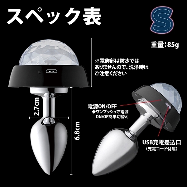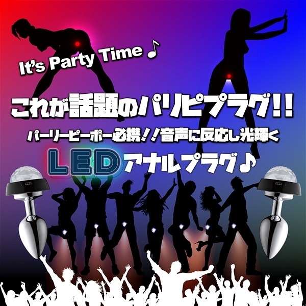 ステンレス製でテール部分に埋め込まれた電飾のLEDライトがサウンドに合わせて光がアクションする「アナルパーリーピーポー」です♪アナルで超パリピになれるという画期的なプラグが新登場!3種類の鮮やかな光(LED)が部屋を彩るアナルパーリーピーポーは3サイズ展開♪こちらは初心者向けのSサイズです!光るアナルプラグでパリピに楽しもう♪電源はUSB充電式ですが電飾部分は防水じゃないのでメンテ時にはご注意ください。