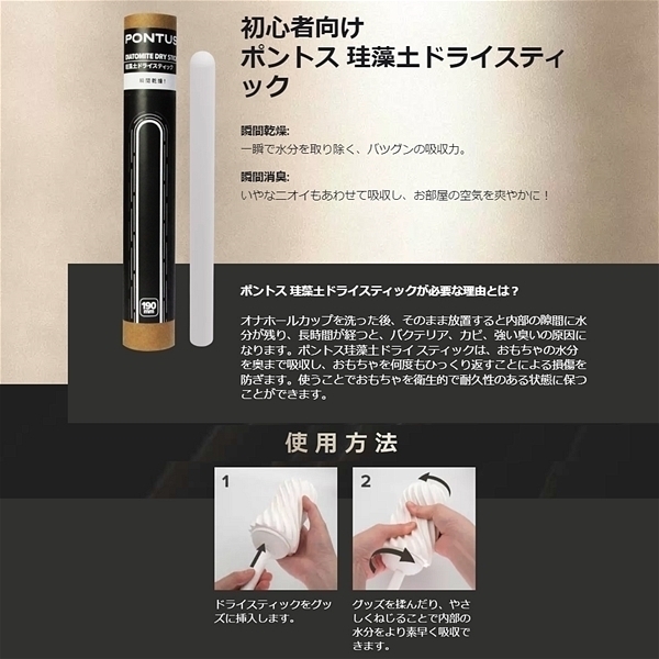 オナホールカップを洗った後そのまま放置すると内部の隙間に水分が残り長時間が経つと、バクテリア、カビ、強い臭いの原因になります。ポントス珪藻土ドライスティックは、おもちゃの水分を奥まで吸収し、おもちゃを何度もひっくり返すことによる損傷を防ぎます。使うことでおもちゃを衛生的で耐久性のある状態に保つことができます。