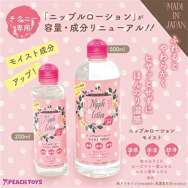 「チクニー専用 ニップルローション(180ml)」が、容量と成分をリニューアルして新発売!!500mlに容量アップでたっぷり使えます。追加成分!「ニップルローション モイスト」は、レモン果実エキス・ローズマリー葉エキスを追加配合!チクニー専用ニップルローションは、ふれるとやわらかくヒヤッとせずにほんのり温感タイプでとても使いやすい商品です。