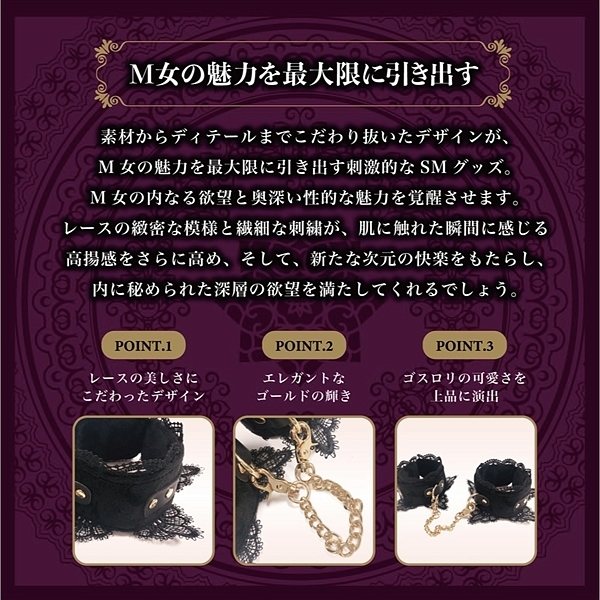 足枷のオプションで新たな世界へ。非日常を体験するのにチープ物では気持ちも盛り上がりません。高級感あるベロア生地とレースで飾りつけた心の奥のM願望を刺激してください。