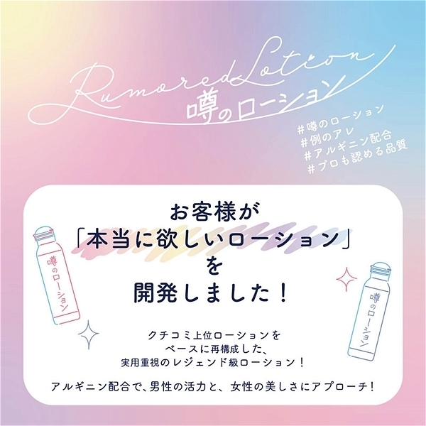 これが業界評判「噂のローション」!プロが認める確かな品質、驚異のなめらかさ、そして圧倒的な持続性!L−アルギニン配合で、男性の活力と、女性の美しさにアプローチ!クチコミ上位ローションをベースに再構成した、実用重視のレジェンド級ローション。スタンダードな万能タイプのテクスチャーに、男性の現役生活を応援する重要アミノ酸L−アルギニンを配合。安心・安全の日本製。洗い流しやすい無色無臭の水溶性。