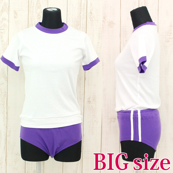 BIGサイズ B96〜110cm・W〜90cm(伸縮時最大114cm)・H〜100cm 上衣:着丈58cm・肩幅39cm・袖丈21cm ブルマ:股上丈32cm セット内容:上衣、ブルマ 素材:ポリエステル65%、コットン35%