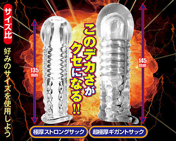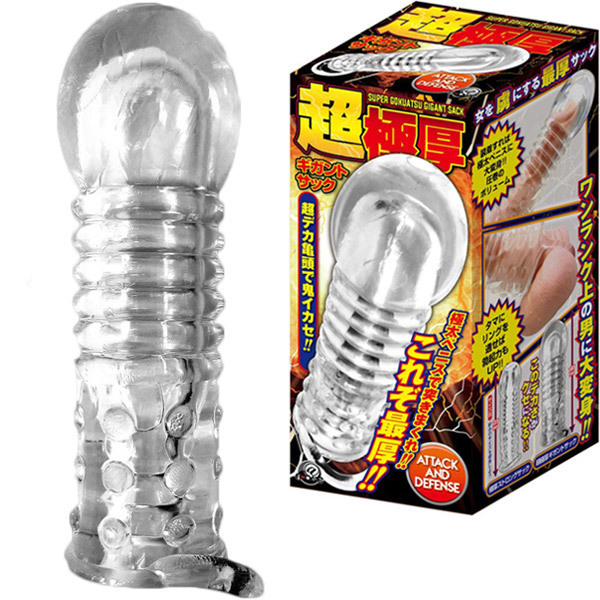 超巨大な亀頭に彼女もびっくり!逞しくさらに強くペニスを強化する「超極厚ギガントサック」です。中が透けて見えるクリアカラーで超が付くほどの極厚っぷりが自慢のギガントサック!中折れ防止・肉厚素材を採用していて敏感な男性器を全て覆ってくれるため、超ロングプレイが可能となりました♪5連の凸凹リングにイボイボ付きの刺激ボディ!全体を覆うオールカバータイプで分厚い仕様なため、大幅なサイズアップが期待でき外れる心配もありません♪サッと装着するだけで勃起力、サイズアップ、射精感を解決してくれる超極厚ギガントサック!お互いが満足したSEXができるよう、是非推奨したいサックです。