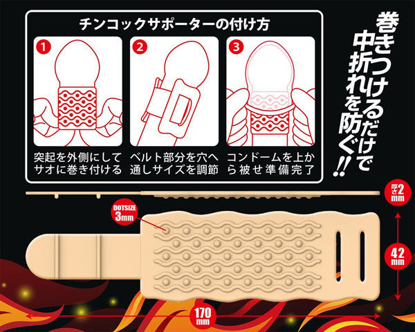 くるっと巻くだけでパワーアップ!勃起力向上&中折れ防止にも役立つベルト型ペニスサポーター。●着け心地の良いTPR素材●厚さ2mmでペニスの太さもUP●粒と波型突起のドットウェーブ加工●攻撃的なジョリジョリ刺激●二段階でサイズ調節可能。竿部分に巻きつけて固定し、コンドームを被せるだけの簡単仕様!中折れを防いで挿入をサポートしながら、パートナーへの刺激も出来る男性用補助グッズです。