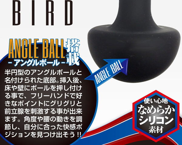 ハンズフリーで前立腺をグリグリ刺激!半円型のアングルボールを搭載したアナルプラグ。●先端が羽のような「BIRD」●内部にしっかりフィット●なめらかなシリコン素材●丸みのある半円フォルムの底部●挿入中も前立腺を自在に刺激。底部が半円型になっているので、挿入中も壁や床に押さえつければイレギュラーな動きを手放しで楽しめます!なめらかなシリコン素材で使い心地も良好なアナルグッズです。