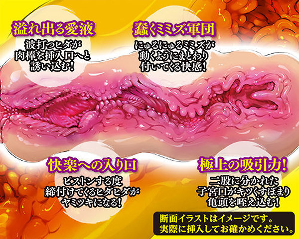 「ミミズ千匹」とは、女性器の内壁が無数のミミズのように動く様子を表現する言葉で、性交時にこの内壁が男性器を刺激することから、名器として知られるようになりました。尾髭丹氏の魅力的な女性を描く絵とA−ONE社のコラボレーションによる非貫通オナホ「名器百景」♪入り口から大きくうねる複雑なヒダが連なり、トルネード状のヒダと横ヒダが奥深くまで続き、まさに「ミミズ千匹」の名にふさわしい構造を持っています。カリを軽く引っかくような刺激が好みの方は、思わず何度も突きたくなるでしょう!縦横にうごめく複雑なヒダの名器を、存分にお楽しみください。