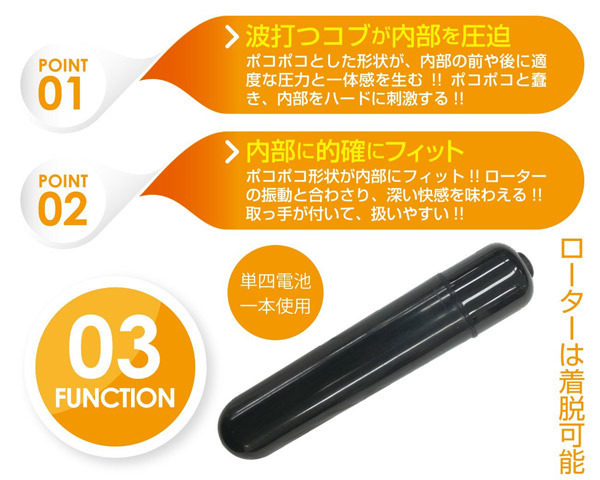 波打つ連続コブでハードに圧迫!挿入しやすいスティック型アナルバイブ「プロクトスティック キュー」。●串団子のような高弾力ボディ●徐々に太くなる連続コブ突起●適度な圧力を生むポコポコ刺激●扱いやすいグリップリング付き●腸全体に響き渡るローター振動●三段階の振動強弱切り替え搭載●内蔵ローターは取り外し可能。ポコポコ形状が内部にフィット!前後に適度な圧力と一体感を与えて下半身を震撼させる電動アナルグッズ。スリムなスティックタイプながら、連続コブでしっかりとした挿入感に!さらに、ローターの振動との相乗効果でより深い快感を味わえる次世代型のスティックバイブです。※電池周囲の保護用シートは外さないでください。