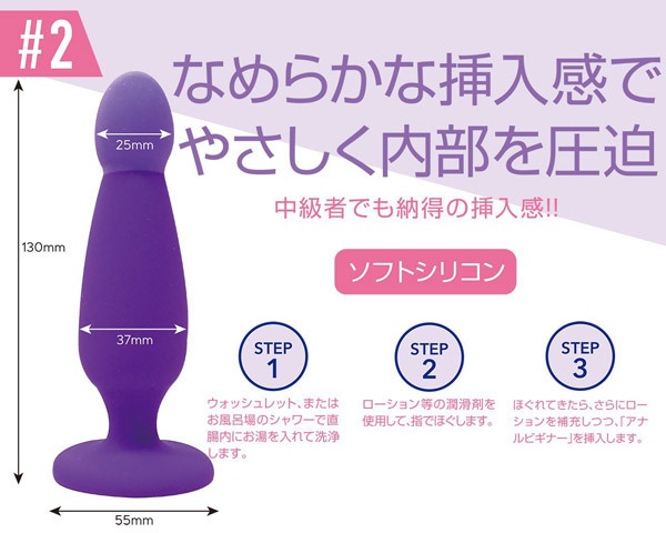 気軽かつ快適にアナルプレイ!挿入感抜群なしなやか素材のアナルプラグ「アナルビギナー #2」。先端はやわらかなふにふに感触のソフトシリコンで挿入もスムーズ!胴体はなめらか&しっかりとしたシリコンで圧迫感を味わえます。するんと入るシルキーヘッド&約3.7cmの最大径で中級者さんでも納得の挿入感を味わえるアナルグッズ!吸盤付きなのでお好きなところに固定してお使い頂けます。