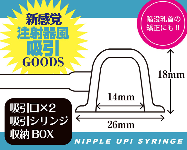 チクビにチューチュー吸い付く!『ニップルアップ!』に新感覚の注射器タイプ登場。吸引口を乳首に当てシリンジの内筒を引っ張り吸引スタート。吸引口は2個セットされているので両チクビやパートナーとも同時に使用可能。抜群の吸着力で感じるチクビへ大変身。<使い方>@吸引口とシリンジをセット。その際シリンジの内筒は押した状態にする。A吸引口内が真空状態になるよう乳頭に押し当てる。Bその状態のままシリンジの内筒を引っ張る。C吸引口とシリンジを取り外しても、吸引状態を保つことができます。●男女兼用