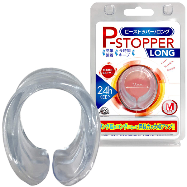 バレずにラクラク包茎矯正トレーニング!!皮を剥きリングを付けるだけの簡単装着!!Pストッパーシリーズにリング幅が長くなって保持力が大幅アップしたロングタイプが登場。リングの厚みが戻りを防ぐ4段構造と内側の高低差のある凹凸の爪が包皮をガッチリガードするので付けたまま寝ても外れない。もちろん人体への影響に考慮したメディカルグレード素材を採用し安心・安全に使用可能!!Mサイズは大きめサイズの人にフィット!