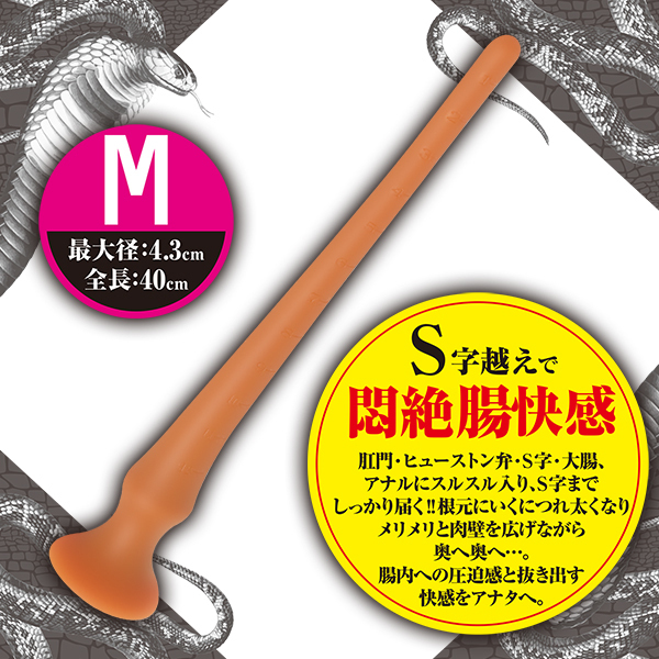 超柔らかで伸縮性もあるソフトシリコン素材を採用した「ロングコロンスネークプラグ」です。こちらはMサイズで太さはそれ程でもなく、全長40cm、最大径4.3cmでS字や大腸までしっかり届くロングサイズとなっています♪悶絶快感必至!これまではアナルのエキスパートにしか味わえなかった気絶しそうな悶絶快感が手軽に味わえます♪腸内を傷つけない柔らかいリキッドシリコン製でアナルにスルスルと入って奥までしっかり届くので、メリメリと肉壁を広げながら奥へ進んで腸内にディルドが収まる感覚が楽しめます。もちもちと滑らかな触感で吸盤付きなので、いろんな体勢で挿入プレイをお楽しみ頂けます!