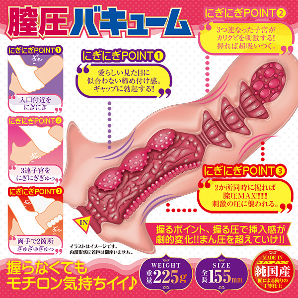 握るポイントや握る圧で挿入感が変化!!にぎにぎ緩めたり締め付けたり圧をコントロールしながら、愉しむオナホール。握りやすい形のオナホールなので、膣圧を調整しやすい。純国産なので、安心安全に使えるのも嬉しい。膣圧をコントロールし、にぎにぎ感を支配しよう。<内部形状>前半部分に配置された、かたまりイボとズリズリ凹凸ヒダがサオを直撃!後半部分は3連子宮がカリクビを圧迫。握れば超吸いつく!!<illustration>九郎
