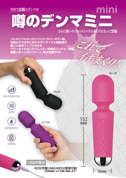 小型でもしっかりイカせてくれる「噂のデンマミニ(MINITOY)」です♪人気のあの電マがさらに使いやすいコンパクトサイズになって新登場!フレキシブルネックにシリコンラバーボディ等、性能はそのままに、持ちやすいサイズと軽量感で使い心地がさらにアップしました♪パワーも十分なリチウムイオン充電式バッテリーを搭載!60分の充電で最大85分使用可能(使用環境により大幅に増減します)。高い防水性能IPX5を誇り、振動パターンは20パターン!3種類のカラーバリエーション展開でこちらはブラックとなっています。