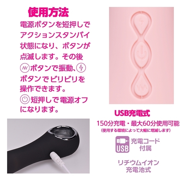 ビリビリ低周波が刺激的な話題の膣トレバイブ、心地良いビリビリに強力な振動で他では味わえない快感を楽しめます。シンプルなストレート形状に肌心地の良い高品質マットシリコンで滑らかな感触。IPX7の完全防水性能だからしっかり洗えて衛生的に遊んで頂けます。振動・ビリビリ刺激は個別に操作が可能で、ビリビリ7パターン。振動12パターン。150分充電で最大60分使用可能(使用環境によって大幅に増減します)●カラー:ピンク