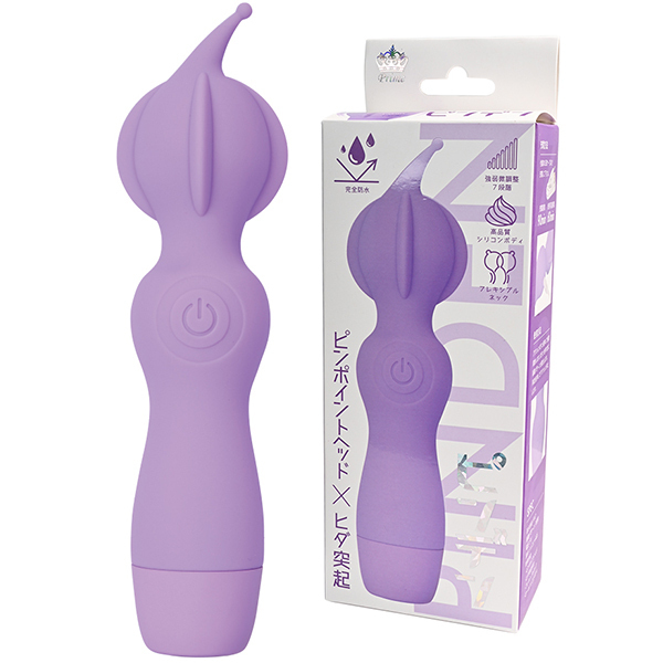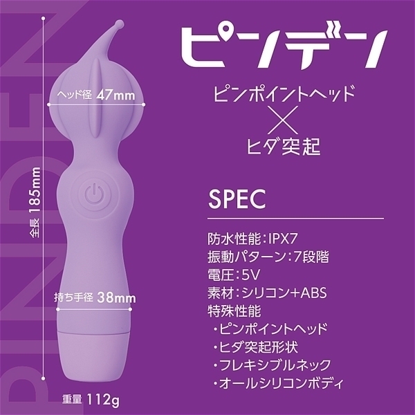 ピンポイントヘッド・ヒダ突起付の完全防水シリコンデンマです。上質振動の強力モーター搭載・高品質シリコンボディ・フレキシブルネックの上級性能に加えてピンポイントを強力刺激出来る先端突起と割れ目に入れて楽しめるヒダ突起形状をプラスしました。振動も一般的なパターン振動では無く、こだわりの強弱微調整可能な7段階振動です。もちろん普通のデンマスタイルも可能なので色々な楽しみ方が出来ます。しかもIPX7の完全防水性能だから使い勝手もバツグンです。90分満充電で60分使用可能(使用環境により大幅に増減します)なリチウムイオン電池内蔵。パワフルなのに繊細な使い方も楽しめるデンマです。●カラー:パープル