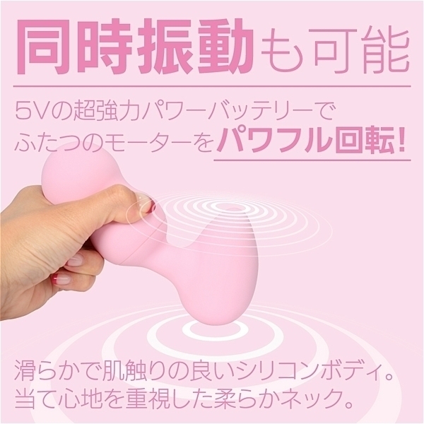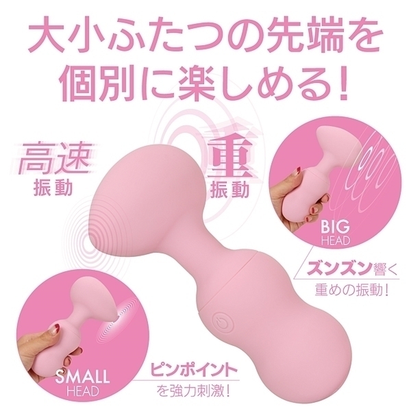 エッグ型ヘッドの左右に大小、サイズの違うモーターを配置!小ヘッドにはピンポイント用に微細振動モーターでポイント刺激を楽しめます。大ヘッドには重振動の大型モーターを搭載してデンマのダイナミックな振動を体感出来ます。電圧5Vの強力振動+高品質なオールシリコンボディだから触り心地も非常に滑らかで防水性能も完全防水を実現(防水等級IPX7)当て心地の良さを上げるフレキシブルネックの反発度にもこだわった絶品デンマです。さらに二つのモーターを個別操作出来るのでお好みに合わせて色々な楽しみ方が出来ます。もちろん同時振動も可能なので共に最強振動にした時のパワーは圧巻です。強弱も5段階に微調整が出来るので振動の好みに合わせて楽しめます。さらに5つのパターン振動も内蔵。満充電120分で最大60分使用可能。(使用環境により大幅に増減します。)●カラー:ピンク