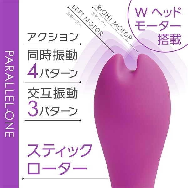 先端に並列で2つのモーターを搭載して、個別に振動させる事が出来るツインモータースティックです。滑らかな肌心地のシリコン素材と振動の質にこだわったモーターを2機搭載。プレジャースポットに合わせた角度と日本人に合ったサイズ感が特徴です。先端は挟んで刺激も出来るように溝を付けています。先端振動は同時振動・個別振動合わせて7パターン。90分充電で最大45分使用可能(使用環境により大幅に増減します)なパワフルなリチウムイオンバッテリーを搭載。IPX5の高レベル防水でしっかり洗えて衛生的です。スマートに振動を楽しめるWモーターヘッドスティックです。●カラー:パープル