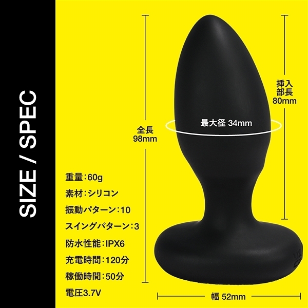 上級快感、アナル揺らし。スイングと振動機能が付いたシリコンアナルプラグです。ハイトルクなモーターを搭載して力強いスイングアクションと上質振動がアナルを徹底的に刺激します。肌触りの良い高品質シリコン素材採用でスムースな挿入を実現しました。IPX6の高レベル防水なのでしっかり洗えて衛生的に長くご使用頂けます。リチウムイオンバッテリーは120分充電で最大50分連続使用が可能です。(使用環境により大幅に増減します。)