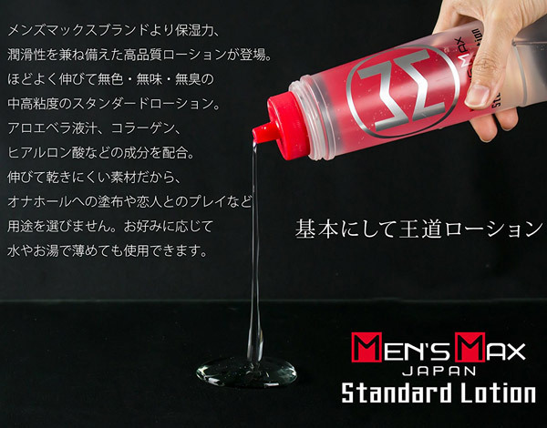 <MEN'S MAX>こだわりの王道タイプ!保湿力&潤滑性を兼ね備えたメンズマックスの高品質ローション。●中高粘度のスタンダードタイプ●程良く伸び乾きにくい使用感●使いやすい無色・無味・無臭●お肌に優しい天然成分配合●内容量360ml入り。これぞ基本中の基本とも言える王道ローションがメンズマックスブランドから登場!アロエベラ液汁・コラーゲン・ヒアルロン酸など、お肌に嬉しい成分も配合!マルチに使える中高粘度なので、オナホールからマッサージプレイまで用途を選ばずお使いいただけます。