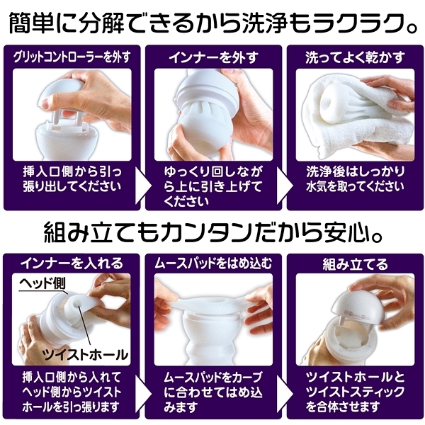 グリットコントローラーは右にも左にもツイスト可能。右と左のひねる方向で内部構造も変化する!お好みのひねり具合で吸着感をコントロール!挿入口のキャップを外しローションを入れて挿入。グリットコントローラーを右に左にねじって刺激の変化を体感せよ。インナーは丸洗い可能。各パーツを取り外し、洗浄・乾燥が終わったら組立てて再び使用可能。アウターケースは耐久性に優れ表面のマット仕上げとフォルムで安心のグリップ感。インナーは約250gで単体のみでの使用も可能なずっしりサイズ。ポケットローション(7ml)付属。グリットコントローラーに付いたスプリングボールとギアカルーセルがかみ合いスムーズな操作性を実現。グリットコントローラーは右にも左にも回せます、右と左のひねる方向で内部構造も変化する!お好みのひねり具合で吸着感をコントロール!<内部構造>@エッグワーム プルプルの卵型ギミックAインチワーム 小型ワームの巣窟を模したギミックBファットワーム 大型ワームギミックによる悪魔の絡みつき