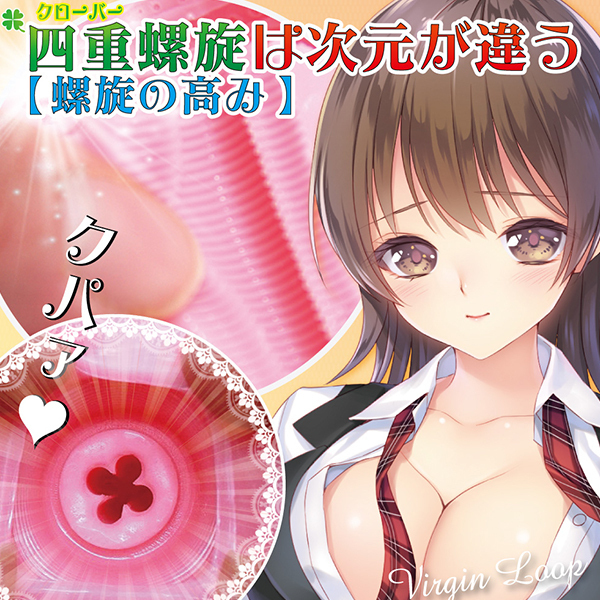 「螺旋の高み」を追求!快感がとまらないオナホール「ヴァージンループ」非貫通型。高弾力素材のバンジータッチを採用!挿入してすぐに始まる縦横無尽の螺旋形状で、ゾリゾリ刺激を体感!四葉のクローバーに見える縦ヒダが奥まで続く構造、この縦ヒダにひねりをプラス!縦ヒダの隙間には、絶え間なくヒダ溝が続いています。ローションポケット採用でローション乾きも防止!先から裏スジまで、容赦なく刺激してくれるオナホールです。※製造時期によりパッケージのデザインが異なる場合が御座います。