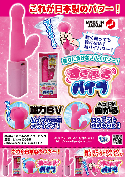 累計1万個も売れた人気商品「すごぶるローター」を手掛けたリグレジャパンより日本製ピンクバイブ。強く握り締めても負けない6Vの強力振動とスウィングを搭載!丸みを帯びた特徴のあるヘッドはクイッと曲がるため、敏感なGスポ責めも可能♪痺れるほどの力強いパワーが全ての女性をアッという間に絶頂へと誘う!