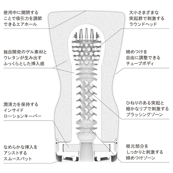 くびれが追加されたことでグリップ力UP!自由自在に締め付け感をコントロールできる「スクイズチューブカップ」。握って揉んで圧迫して…自分好みの力加減で締め付けることで多様な刺激をお楽しみいただけます♪使用中にエアホールを開閉すればバキューム力を調節することも◎
