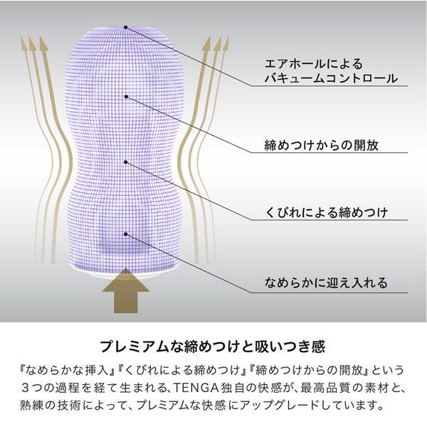 一年頑張ったご褒美に、大好きな彼氏への贈り物に◎スタンダードよりも1.5倍肉厚にしたことで、しっとり濃密な挿入感へ進化したテンガの「プレミアム・オリジナルバキュームカップ」。ベースとなるゲル、ウレタンフォーム、ローションなど全てが最高級品質!15年間培ってきた技術と最高品質の素材によってリニューアルした、くびれによるプレミアムな吸着感をお楽しみください。