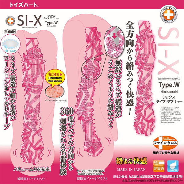 全方向から絡みつく触手の快感が超気持ちいい!一度使うと手離せなくなるほどハマっちゃう極上オナホール。●シックス・タイプ「W」ver●ふわっと優しく包み込む発泡素材を採用●内部:360℃配置した無数のミミズ千匹構造●細かな溝がローションをしっかりキャッチ●バキューム力も抜群●日本製・ローション付き。挿入直後から無数の触手がどこまでも絡みついてくる刺激たっぷりのオナホールです。