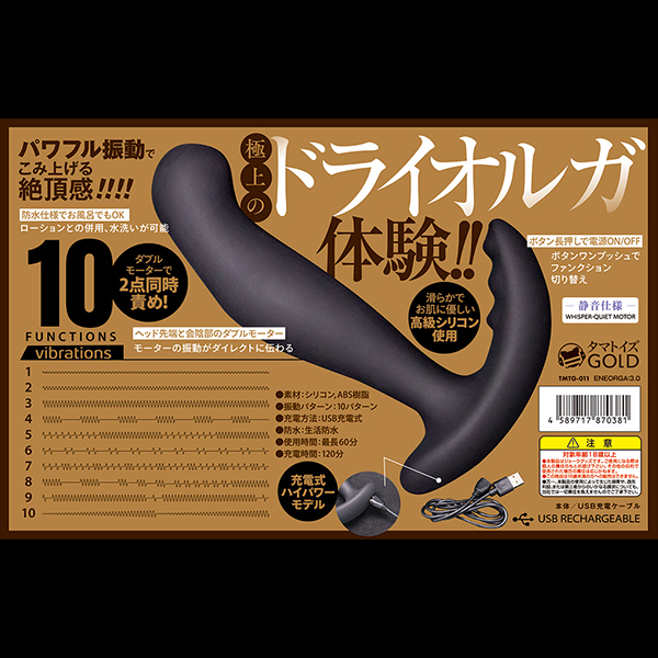 前立腺と会陰のニ箇所を刺激してくれるアナルバイブ「ENEORGA3.0」です♪強弱含む10種類の振動パターンを搭載した豊富な振動バリエーションが自慢でボディはシリコン製!比較的ストレートで扱いやすく、先端の膨らみは前立腺にフィットしやすくネックは細身♪入れっぱなしでもアナルへの負担が少なく初心者でも挿入しやすくなっています!会陰を刺激するウェーブ状の突起が付いた部分にはモーターが内蔵されており、挿入シャフト先端の内蔵モーターと連動して絶妙な振動刺激を与えてくれます♪電源はUSB充電式で120分のフル充電で連続稼働60分!生活防水仕様なのでプレイ後に丸洗いできてメンテも簡単♪豊富な振動バリエーションでドライへと導いてくれます。●メーカー型番:TMTG-011